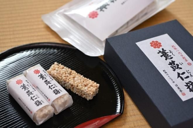 約380年前に生まれた幻の銘菓 薏苡仁糖を復活させるために、精白はとむぎを栽培から始め、現代に残った製法を約6年間思考錯誤を行い、自家製のはとむぎを使用し手作りで完成した「伝統あるおこし」です。ほろほろとした食感で優しい甘さが特徴です。